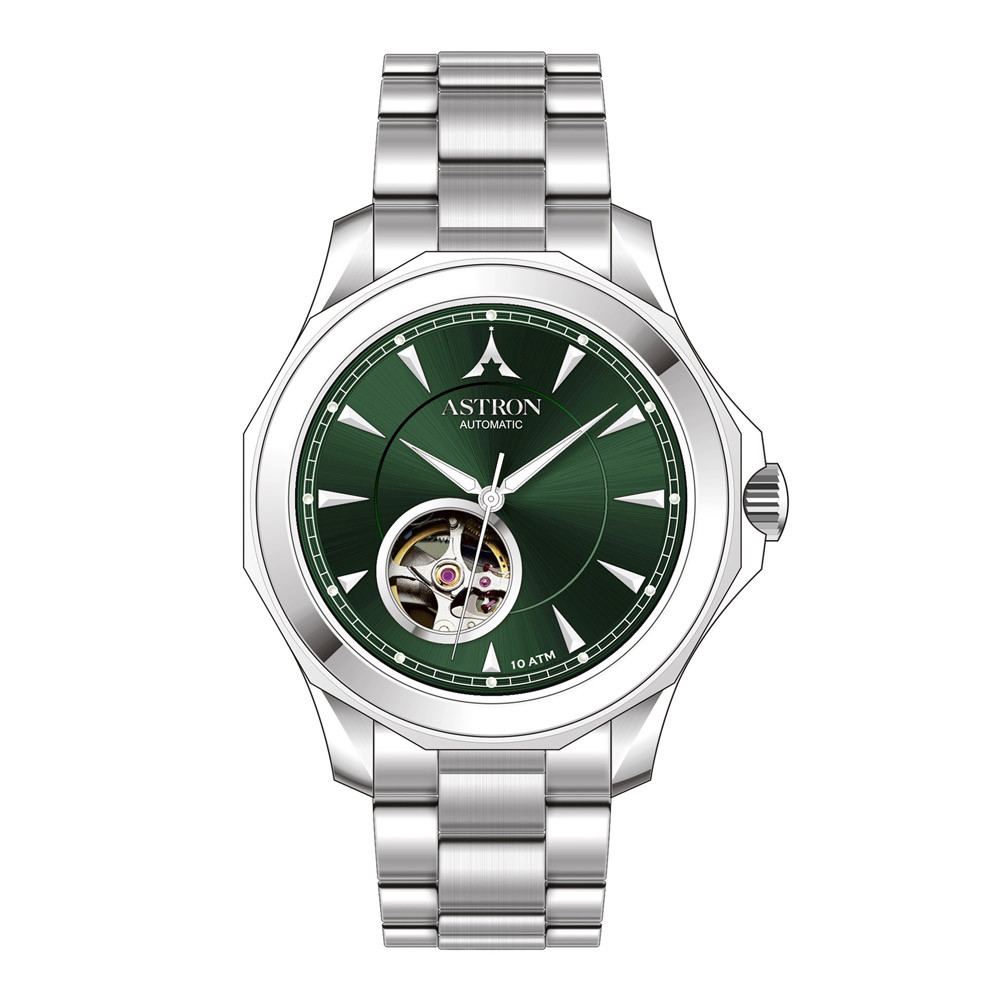 ASTRON 8066-3 automata férfi karóra, ezüst színű nemesacél tok, ezüst színű nemesacél csat, zöld számlap, zafír üveg, mechanikus automata szerkezet, WR100M vízállóság